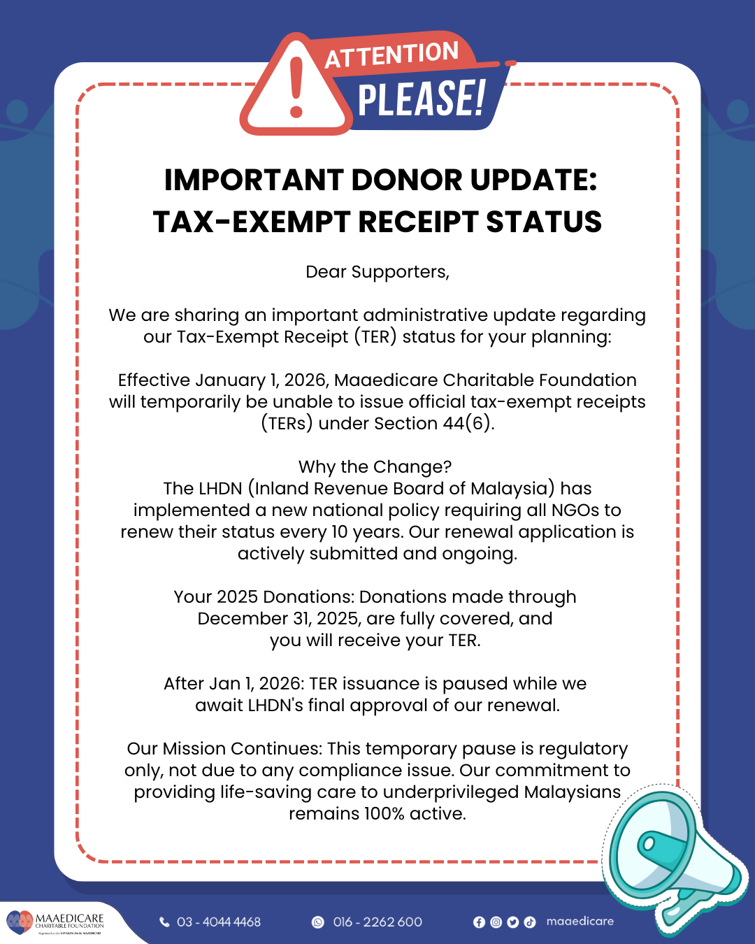 Yayasan Amal Maaedicare focuses on providing affordable, high-quality medical care to underprivileged communities across Malaysia. We address critical health challenges by subsidising treatments for kidney and heart diseases while promoting early prevention and public awareness.